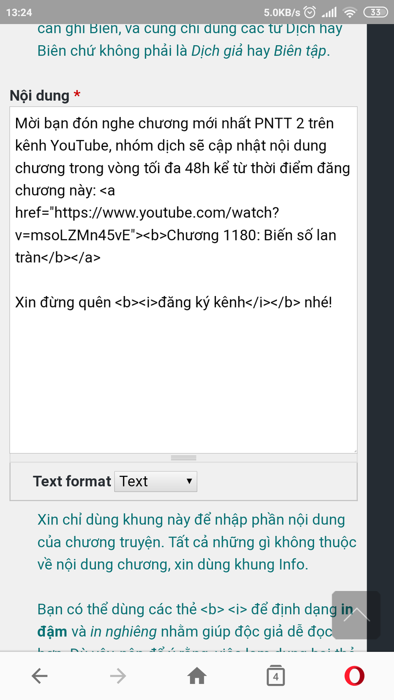 Đã nâng cấp tài khoản Reader của huynh lên S-Editor, sau này huynh muốn phần nội dung có link thì copy nguyên nội dung của đệ ở chương 1180, đổi link Youtube và tên chương, sau đó chọn "Text" ở Text Fomat như hình dưới, không chọn cái này là không dẫn link được đâu.86 ta nhé.