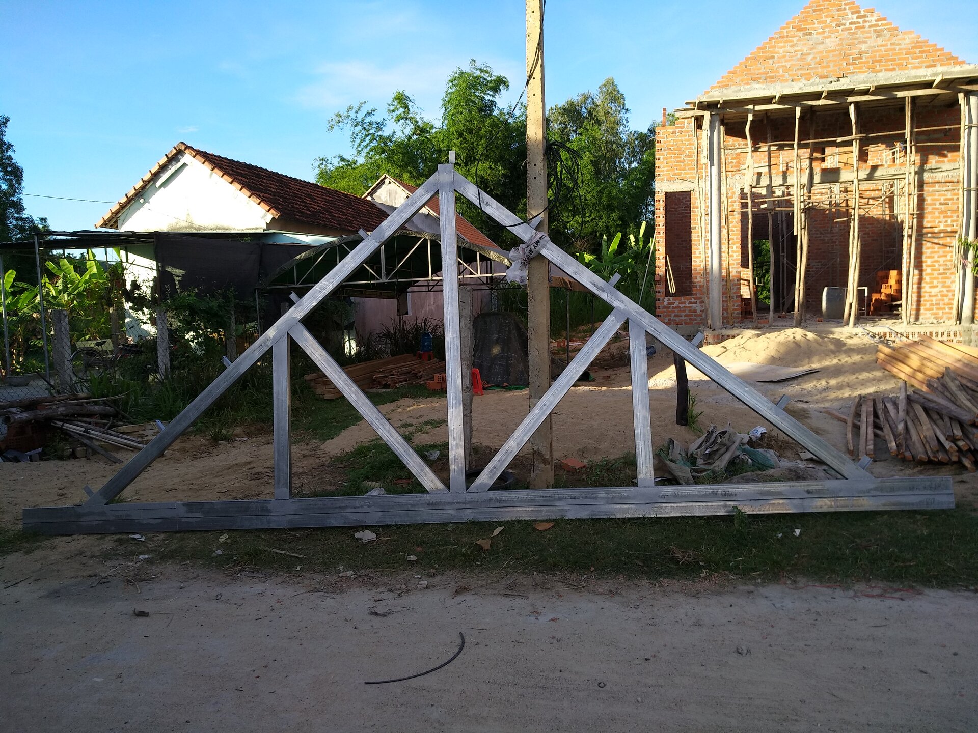Kèo làm sắt 3 cây 6 x 12 và 1 cây 5 x 10, dày 1,8 ly. Gác kèo sắt, còn lại gác đòn tay (7 x 14), rui, mè bằng gỗ.