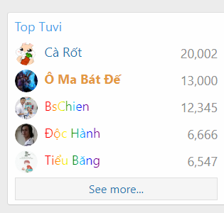 | @Lạc Tình Nhi | Nguyên Anh hậu kỳ | 07/11/2019 | Cẩm Lý Ngư | 3,000 |