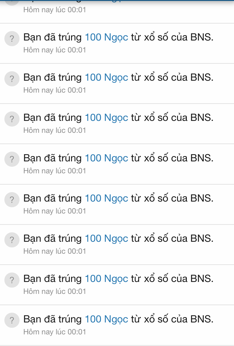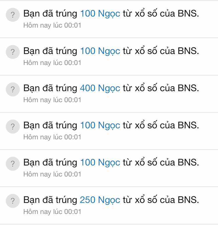 Hôm qua tại hạ mua 24 Vé số Dạo mất 1.200 ngọc. Trúng đc tất cả 2.050 ngọc. Coi như là bước đầu trên con đường tu luyện đã êm đẹp. :daica: