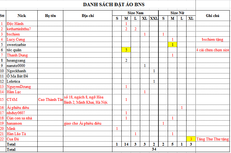 Mọi người kiểm tra lại danh sách xem có sai sót gì ko, nhất là size áo. Ai còn màu đen thì chuyển khoản nha :)