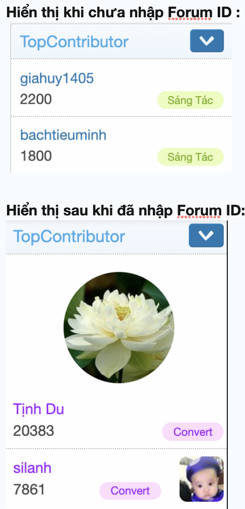 1. Thông tin hiển thị tại danh sách Top Contributor sẽ hiển thị màu tên và avatar:
