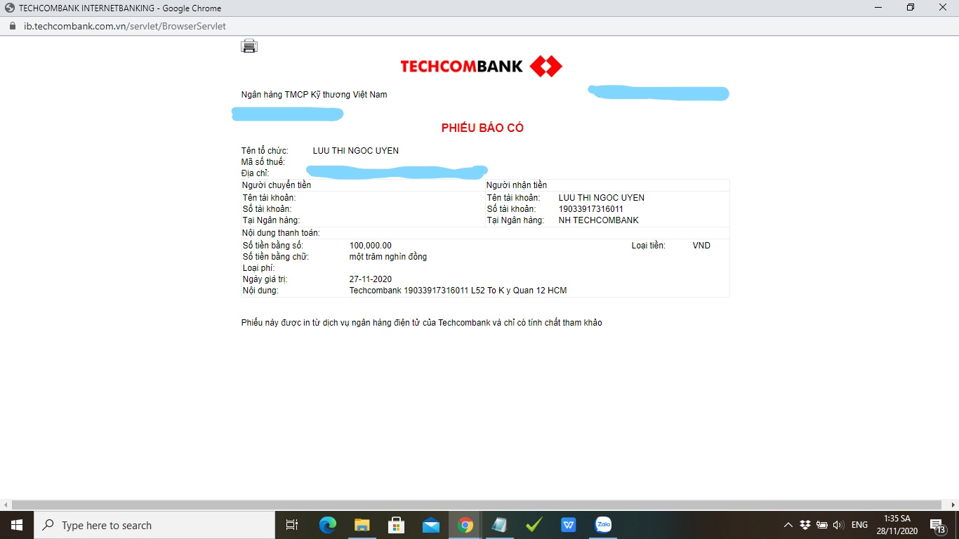 Ngân hàng:Techcombank - CN Nguyễn Ảnh Thủ