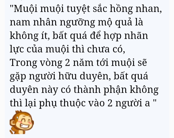 ý huynh saoTrong vòng 4 năm tới con sẽ gặp được công việc có thể hái ra tiền, bất quá việc này có thành hay không thì lại phụ thuộc vào ý trời![]()
